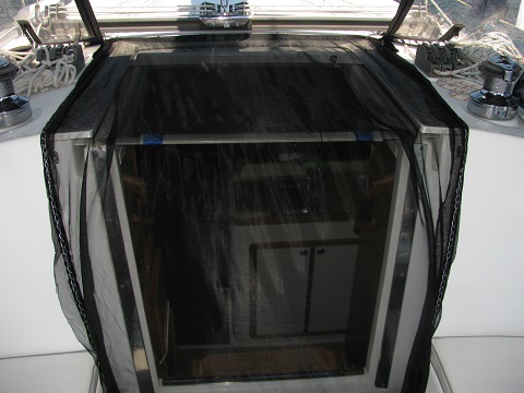The companion way on the Catalina is nice and wide and wonderful for getting in and out of the inside. Unfortunately so do the flies and those nasty mosquitos. So we looked into getting an insect screen. We found that those manufactured solutions were pretty expensive.