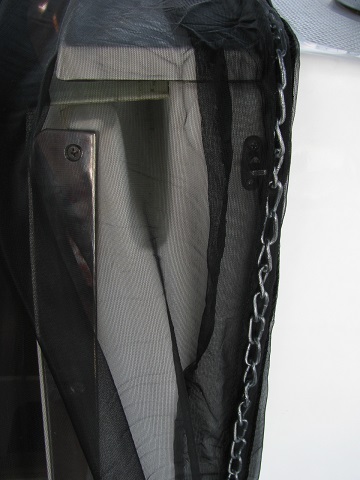 Friends of ours mentioned that all that they do is use bridal veil held in place with soup cans. Well I’m not crazy about having soup cans dropping on my head but we liked the idea of the veil. So we picked up some black veil material from Fabric Land, so twisted galvanized chain from Home Depot and made our own fly screen.
