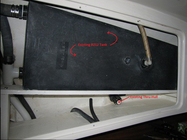 The attached image shows the existing B212 tank and the thru-hull location. The new B179 would be almost as big as the storage locker’s opening, thus covering the thru-hull.